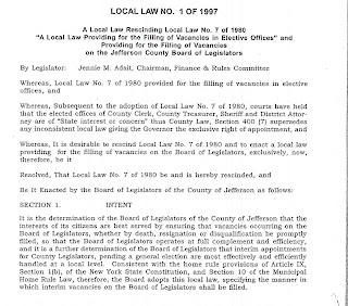 Local Law #1 of 1997 determies the process for for filling a vacancy on the Board of Legislature.